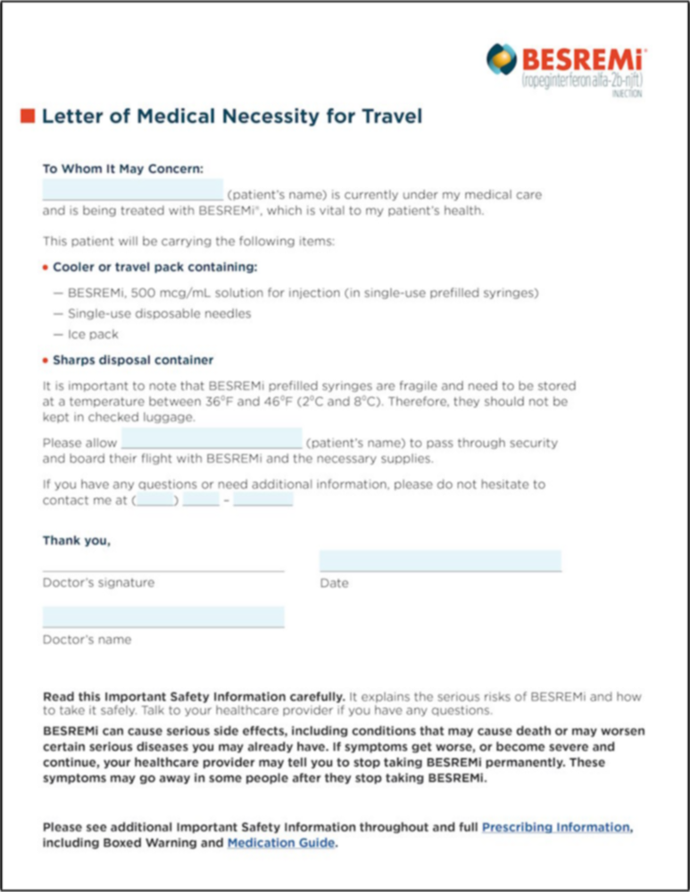 If you’re flying with BESREMi, this letter can help you explain your medication needs to airport security to ensure smoother travel.